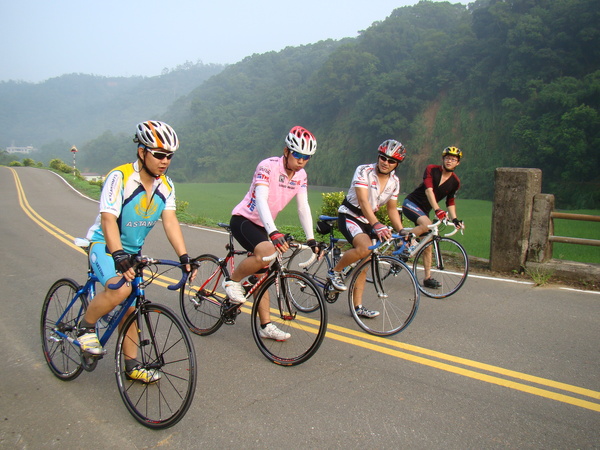 當我們的路線由一般道路轉進山路時,Jason就好像有點不行了>"<我們還跟他說"這只是暖身,還沒開始"但是Jason聽完就一副很想烙跑的樣子XD但是經過我們的好言相勸他後來也乖乖的跟著我們騎了~"~這次我們先派Jet陪Jason騎一段時間我們才跟上去,因為不想讓Jason有壓力,後來大約等了有二分鐘吧,我們其他人才出發,但是..........才騎一下下就追到Jason了=.=算了!!繼續騎吧!!後來Stan自願陪騎(因為是他的老大咩>"<)一路上我就跟Jet嘻嘻哈哈邊聊天邊拍照,其他人也差不多都放慢速度慢慢騎,當騎到一座橋時,我忘記是誰先提議說"騎公路車的一定要尬一下爬坡"切~結果就四台公路車排排站準備尬車